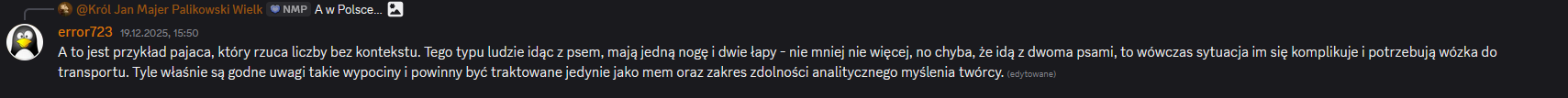 mluczak.kutno Posted 3 hours ago Posted 3 hours ago 4 minuty temu, error723 napisał(a): Czyli faktycznie, nie widzisz różnicy pomiędzy marudzeniem, a zgłaszaniem błędu i uznajesz, że możesz zatruwać dziesiątkami wiadomości uważając, że czym bardziej będziesz jęczeć tym większe to zrobi wrażenie Tak. Jak Ci się nie podoba, to możesz mnie dodać do ignorowanych. I tak nie masz zwykle do powiedzenia nic więcej ponad "jest super", ewentualnie "jak się nie podoba, to zrób sam lepsze". Wymiana wiadomości z Tobą nie ma najmniejszego sensu, więc proszę- nie odpisuj już więcej. Teraz, misiek_131415 napisał(a): Nie możesz zapisać gry w momencie jak ustawiają się przebiegi czy jakoś tak. O ty wiadomo już od fazy testów save. Lajw wujka bohuna jak próbował zapisac grę na Łodzi Kaliskiej. Tam zobacz i zrozumiesz o co biega. Nie zapisuje się na stacji chyba tylko na trasie. Jakoś tak to na razie działa. Tak, tak działa to na scenariuszach oficjalnych. Wiem, sam sprawdzałem, z mieszanym efektem. Na scenariuszu od Patwrobel przy próbie zapisu nie dzieje się jednak nic. Nie ma komunikatu o błędzie, nie ma komunikatu o powodzeniu. Nie ma też zapisanego pliku, co widać jak się próbuje wczytać w danym scenariuszu zapis. Jest pusta lista, mimo próby zapisu co każdy postój. Teraz, misiek_131415 napisał(a): Mam wrażenie że ucieszyłeś się z tego:)))) Nie? Scenariusz jest super a ze względu na braki czasu nie mogłem go skończyć. Straciłem tylko czas, faktycznie- mam się z czego cieszyć... 2 minuty temu, misiek_131415 napisał(a): Zapisz stan gry w Maszynie. Wtedy narzekaj na Simrail. W Maszynie nikt nigdy nie powiedział, że mają zapis gry. Nikt nawet nie powiedział, że będą mieli. To jest taka dość DROBNA różnica. Ps. 15 minut temu, error723 napisał(a): bez ubliżania, jęczenia i tupania Nie lubię takich osobistych zagrywek, ale niestety czytuje dokładnie Discorda i kojarzę mniej- więcej, co kto napisał. Do mnie się przywalasz, że używam formy "Oskarek", to Ty w zamian wolisz ludzi wyzywać od pajaców: Faktycznie, nigdy nikomu na forum nie ubliżałeś. Discord jednak to nie forum, więc "dorosłym" nagle wolno już obrażać? A to jest nawet lepsze, bo skierowanie nie do ogółu a w konkretnego innego usera (mam nadzieję, że za to wyłapałeś konkretnego bana):