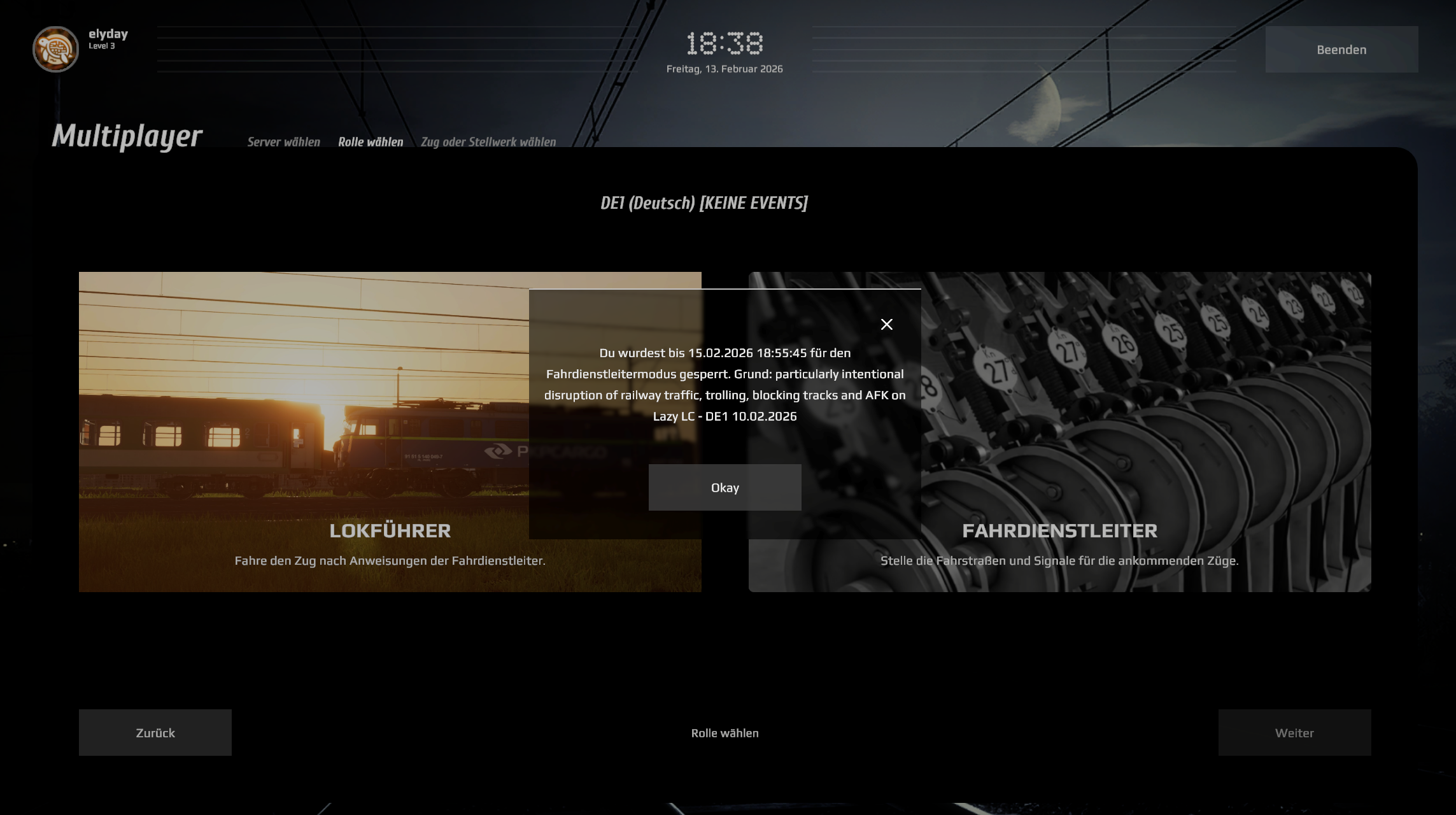 elyday Posted 5 hours ago Posted 5 hours ago I received a ban today for the dispatcher mode, which lasts until Sunday evening. Apparently, I was either AFK or trolling or blocking tracks on DE1 at the Lazy LC station on Tuesday. I can't remember doing anything like that. The only situation I can remember right now is that at a certain point, no more trains could be sent to and from Przemiarki. The AI there either crashed or had other problems. This led to a train jam at the station there. The AI was supposed to send several trains to Lazy LC, but it didn't. Is there any historical data available that might help me better understand this ban?
